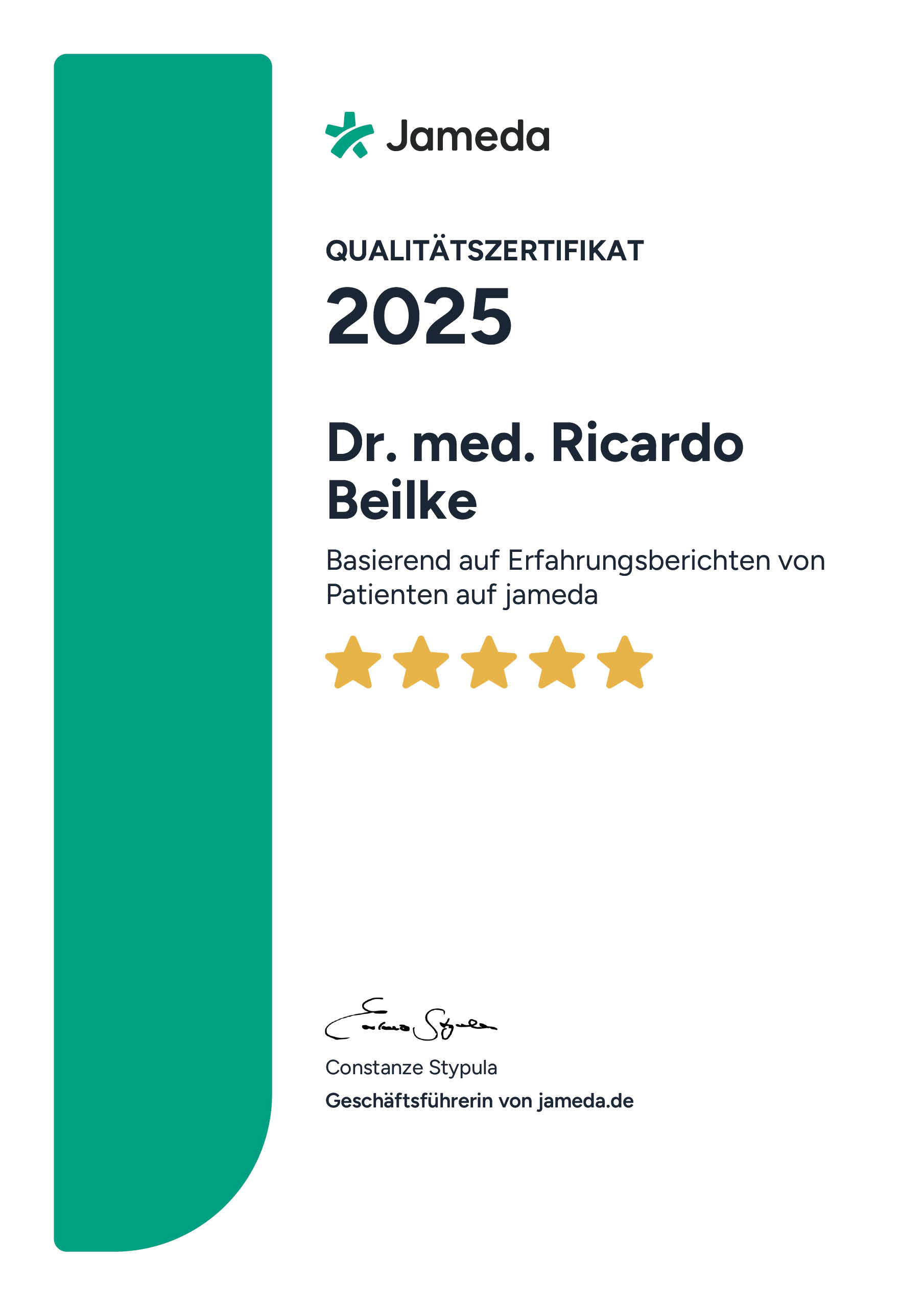 Wir freuen uns über das Jameda-Qualitätszertifikat – eine Auszeichnung für besonders hohe Patientenzufriedenheit, transparente Kommunikation und hervorragenden Service.